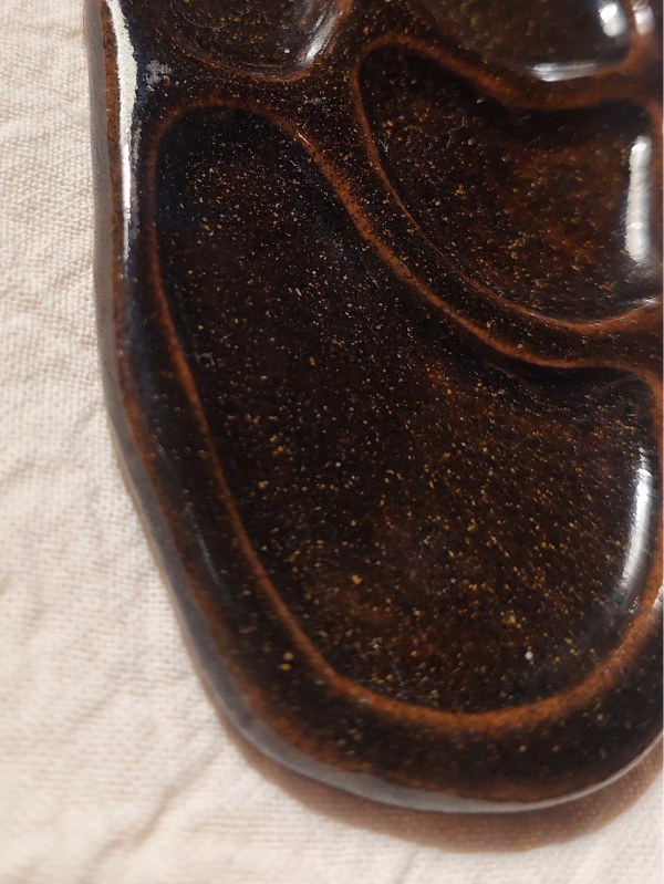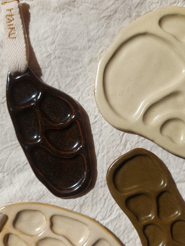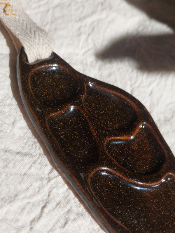 Paleta para pintar hecha en gres con modelado manual, esmaltado en color amarronado. Viene con ojal de cinta hilera de algodón para colgar.
